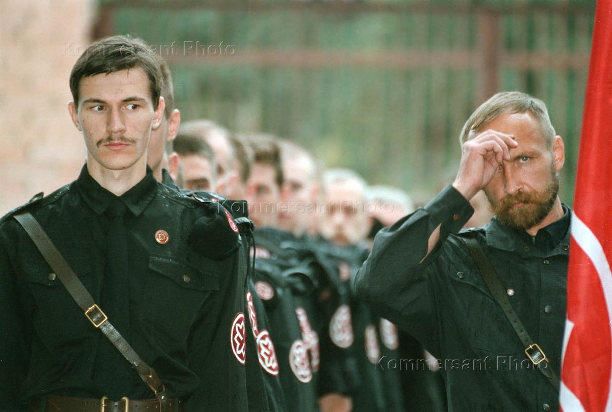 Members of extremist political group Russian National Unity handing our propaganda materials.