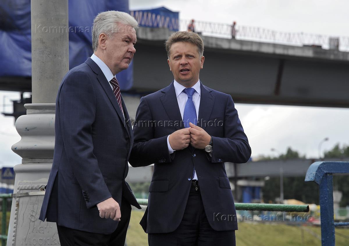 Временно исполняющий обязанности мэра Москвы Сергей Собянин (слева) и министр транспорта России Максим Соколов (справа) во время посещения строящейся Бусиновской транспортной развязки.