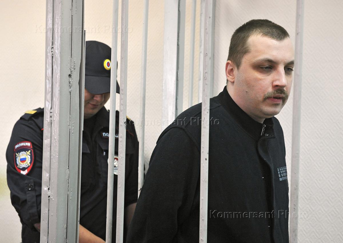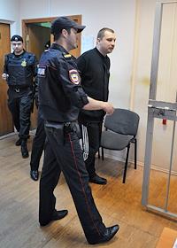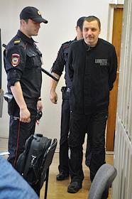 Обвиняемый по делу о массовых беспорядках на Болотной площади 6 мая 2012 года Михаил Косанко (справа) во время рассмотрения дела в Замоскворецком суде.