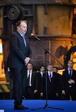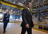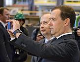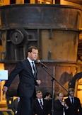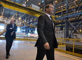 Председатель правительства России Дмитрий Медведев во время посещения нового металлургического завода "НЛМК-Калуга" по производству стали и сортового проката строительного назначения.