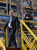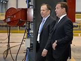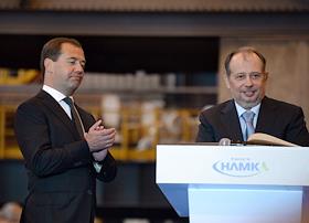 Председатель правительства России Дмитрий Медведев (справа) и председатель совета директоров НЛМК Владимир Лисин (слева) во время посещения нового металлургического завода "НЛМК-Калуга" по производству стали и сортового проката строительного назначения.
