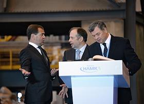 Председатель правительства России Дмитрий Медведев (в центре), председатель совета директоров НЛМК Владимир Лисин (слева) и губернатор Калужской области Анатолий Артамонов (справа) во время посещения нового металлургического завода "НЛМК-Калуга" по производству стали и сортового проката строительного назначения.