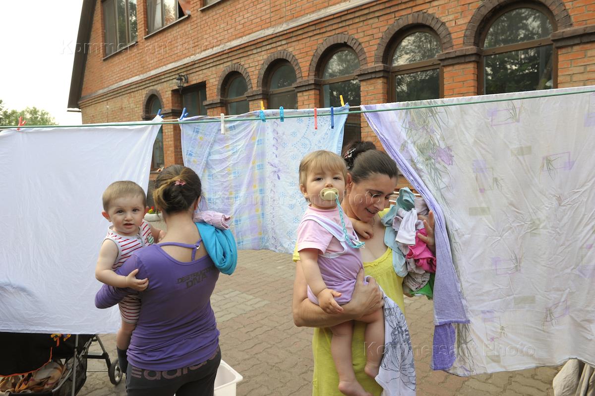 Социальный приют для неблагополучных семей "Теплый дом". Мамы на прогулке с детьми во дворе дома.
