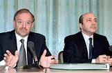 British Foreign Secretary Robin Cook (left) and Foreign Minister of Russia Igor Ivanov (right) on press conference during Cook's visit to Russia