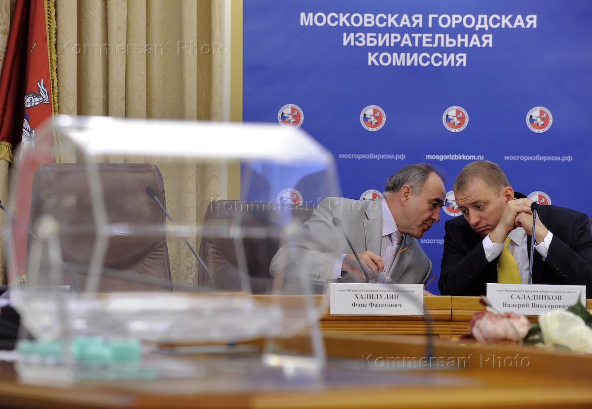 Члены Московской городской избирательной комиссии Фаяс Халилулин (слева) и Валерий Саладников (справа) во время жеребьевки бесплатного эфирного времени и графика встреч с избирателями для кандидатов в мэры Москвы. Жеребьевка прошла в здании Мосгоризбиркома.