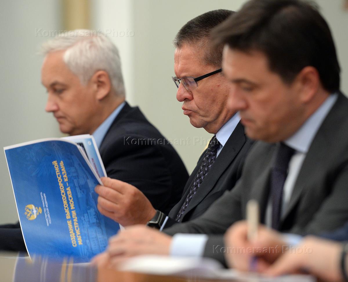 Совещание о реализации проекта строительства высокоскоростной железнодорожной магистрали Москва – Казань. Слева направо: помощник президента России Андрей Белоусов, министр экономического развития России Алексей Улюкаев и временно исполняющий обязанности губернатора Московской области Андрей Воробьев на заседании в резиденции Ново-Огарево.