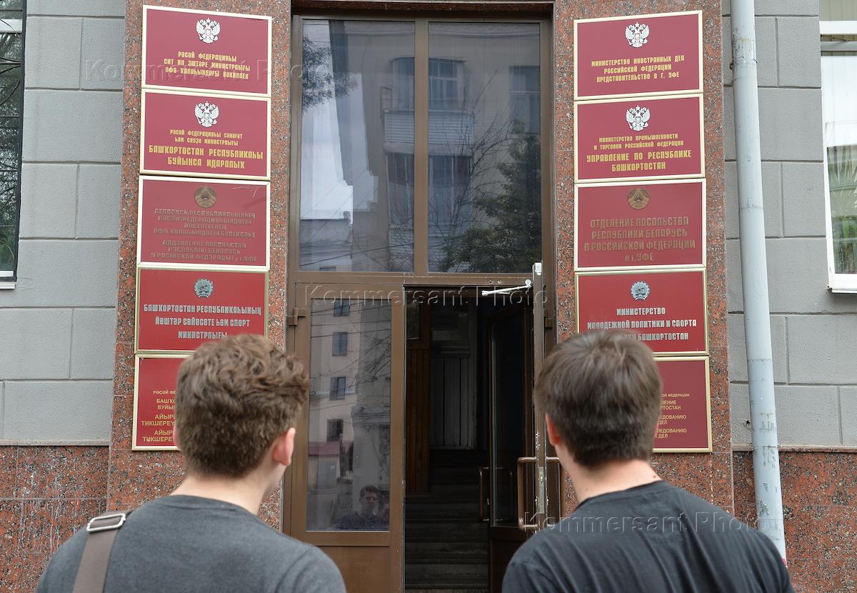 Виды Уфы. Здание, в котором располагаются: представительства министерства иностранных дел России, министерства промышленности и торговли России, отделение посольства Республики Беларусь в России в Уфе, министерство молодежной политике и спорту Республики Башкортостан и Следственный комитет. Вывески при входе в здание.