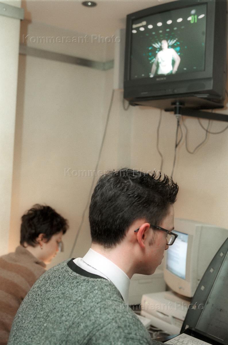 Internet-cafe in Stoleshnikov lane. People behind computers.