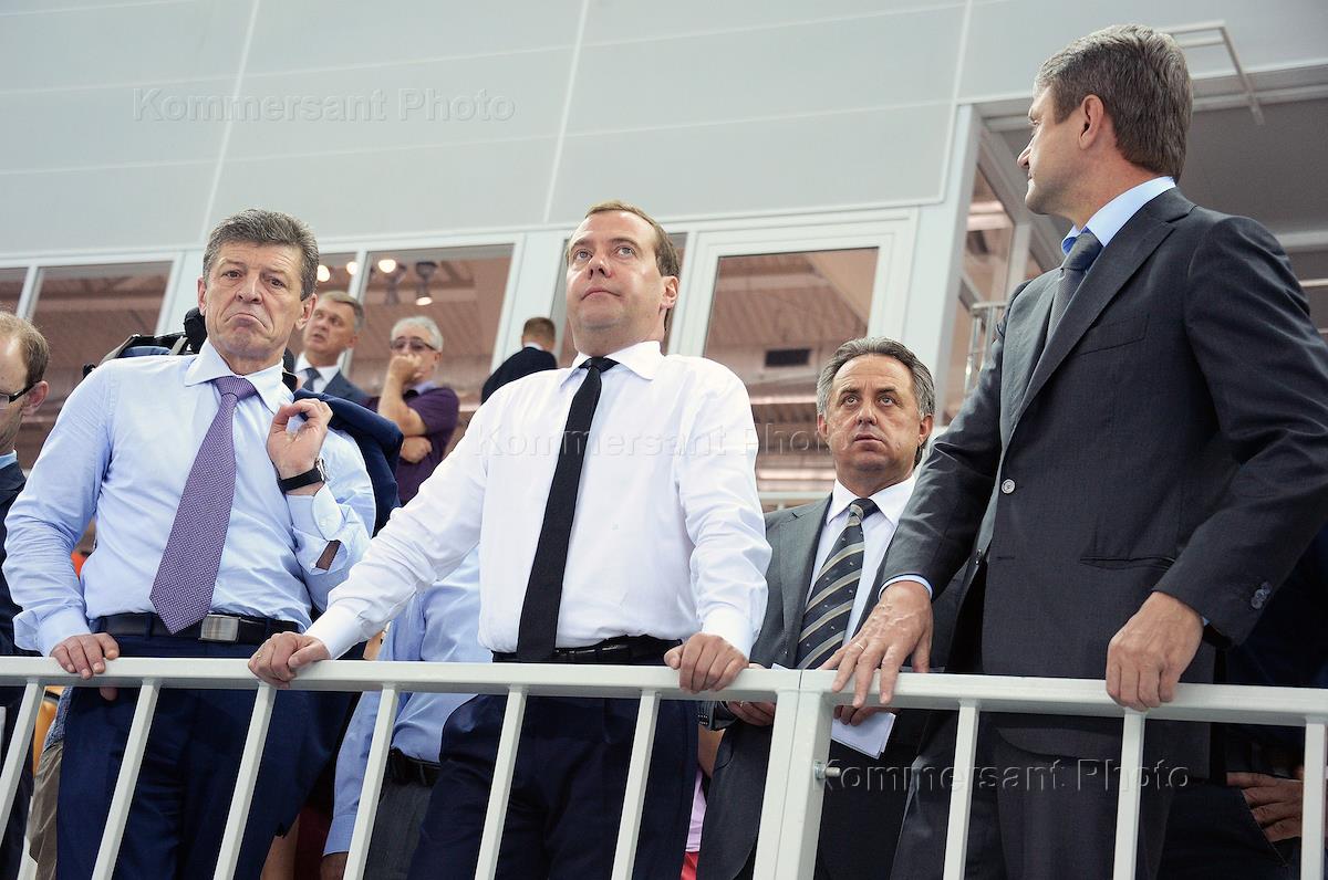 Рабочая поездка председателя правительства России Дмитрия Медведева в Сочи. Слева направо: заместитель председателя правительства России Дмитрий Козак, председатель правительства России Дмитрий Медведев, министр спорта Виталий Мутко и губернатор Краснодарского края Александр Ткачев во время посещения конькобежного центра "Адлер-Арена".