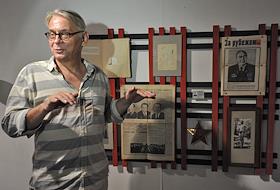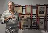 Художник Сергей Шутов на церемонии открытия своей выставки "Контейнеры, пакеты, цистерны, мемории" в Государственном центре современного искусства (мансарда Дома Поленова).