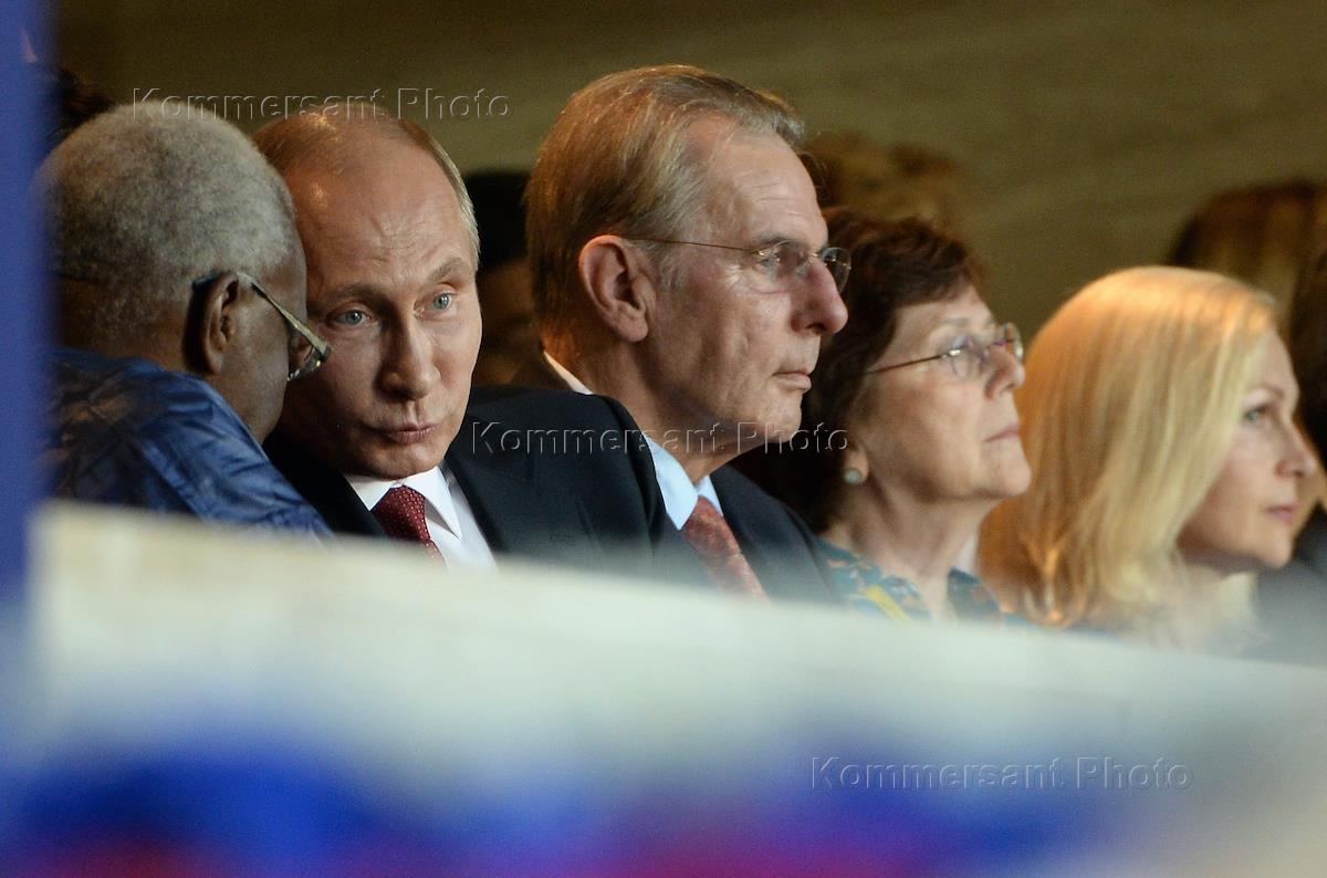 Глава Международной ассоциации легкоатлетических федераций (IAAF) Ламин Диак (слева), президент России Владимир Путин (второй слева), президент Международного олимпийского комитета Жак Рогге (в центре) с супругой Анной (вторая справа) и супруга исполняющего обязанности мэра Москвы Сергея Собянина Ирина (справа) на церемонии открытия XIV чемпионата мира по легкой атлетике 2013 года на Большой спортивной арене (БСА) "Лужники".