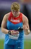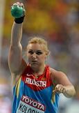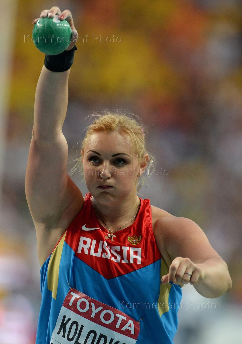 XIV Чемпионат мира по легкой атлетике на стадионе "Лужники". День третий. Российская спортсменка Евгения Колодко в финальных соревнованиях по толканию ядра среди женщин.