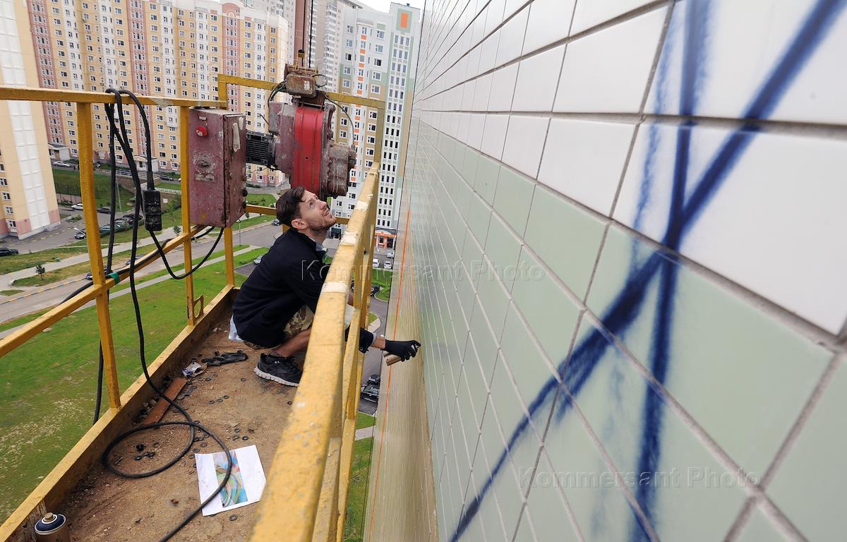 Райтер Паша Вайс во время работы над граффити.