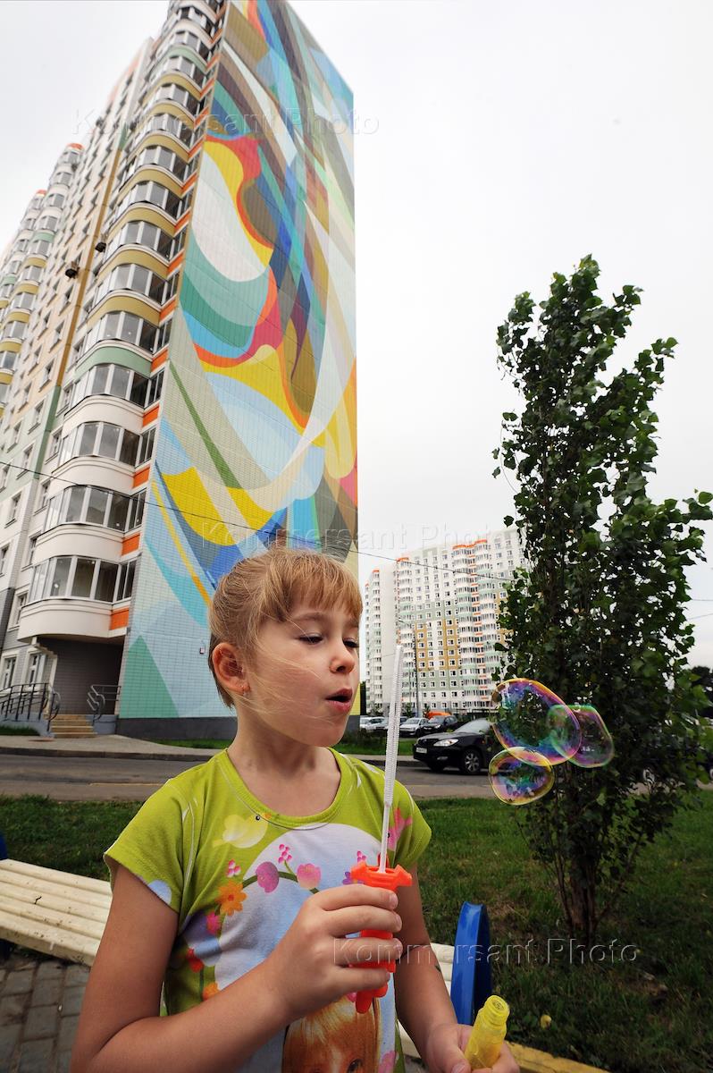 Work graffiti writer Pasha Weiss. Graffiti on the end of a house. A girl riding a white horse through the streets of the city.