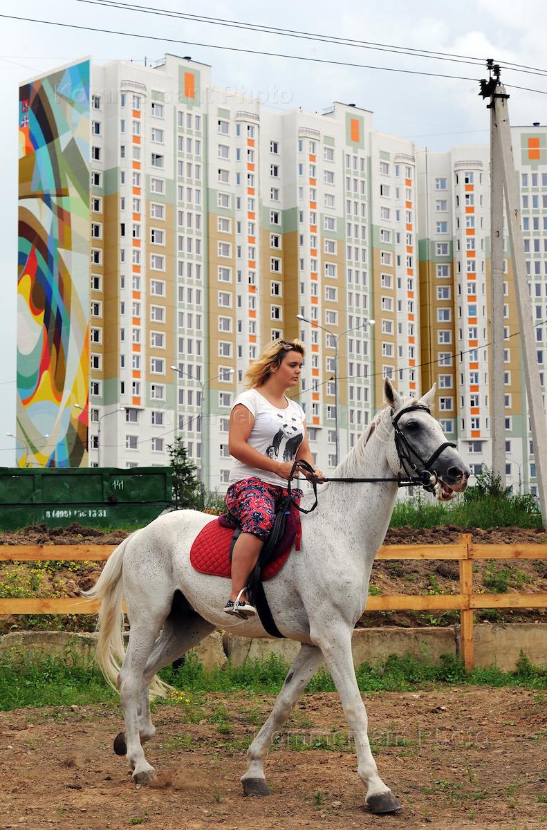 Work graffiti writer Pasha Weiss. Graffiti on the end of a house. A girl riding a white horse through the streets of the city.