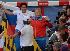XIV Чемпионат мира по легкой атлетике на стадиноне "Лужники". День седьмой. Российская спортсменка Татьяна Лысенко (слева) после финальных соревнований в метании молота среди женщин.
