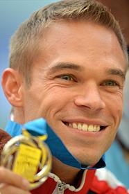 Чемпионат мира по легкой атлетике в Лужниках. День шестой. Серебряный призер забега на 800 м среди мужчин, американский спортсмен Ник Симмондс на церемонии награждения победителей.