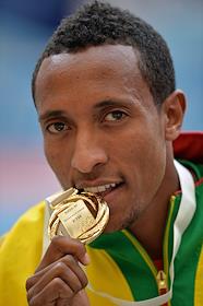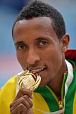 Чемпионат мира по легкой атлетике в Лужниках. День шестой. Победитель забега на 800 м среди мужчин, эфиопский спортсмен Мохаммед Аман на церемонии награждения победителей.