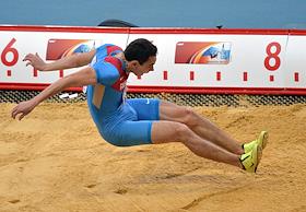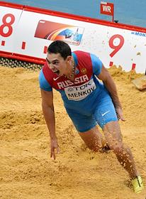 XIV Чемпионат мира по легкой атлетике на стадиноне "Лужники". День седьмой. Российский спортсмен Александр Меньков во время финальных соревнований по прыжкам в длину среди мужчин.
