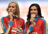 Церемония закрытия XIV Чемпионата мира по легкой атлетике. Россиянки Светлана Школина (слева), завоевавшая золотую медаль и Анна Чичерова (справа), завоевавшая бронзовую медаль в соревнованиях в прыжках в высоту среди женщин, во время церемонии награждения на стадионе "Лужники".