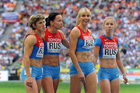 XIV Чемпионат мира по легкой атлетике. Российские спортсменки, слева направо: Елена Болсун, Елизавета Савлинс, Наталья Русакова и Ольга Белкина после финиша в финальном эстафетном забеге 4х100 м среди женщин. Соревнования прошли на стадионе "Лужники".