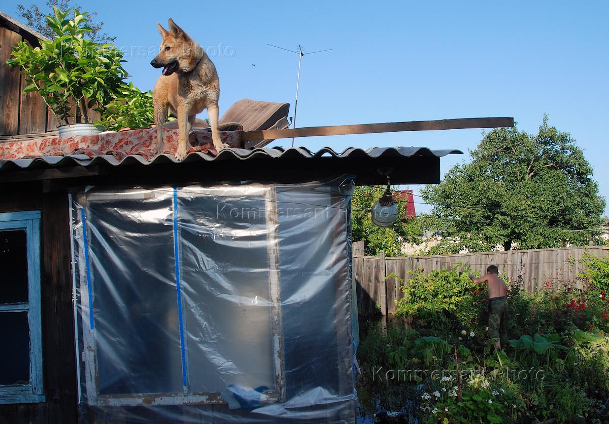 Consequences of the floods in the village of Ust-Ivanivka, Blagoveshchensk district of the Amur region. Dog on the roof of the house.