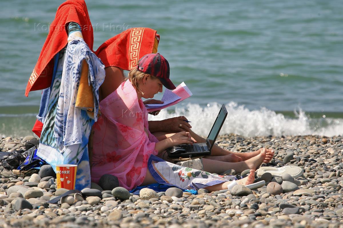 Виды Абхазии. Отдыхающие на берегу Черного моря.