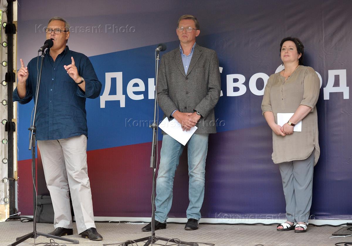 Сопредседатели "Республиканской партии России — Партии народной свободы" (РПР-ПАРНАС) Михаил Касьянов (слева) и Владимир Рыжков (в центре) на митинге оппозиции в День Государственного флага России. Митинг, организованный партией "РПР-Парнас", движениями "Солидарность", "Комитет 6 мая", Защитников Белого дома, "За права человека", "Белая лента", "Партия 5 декабря", Московской Хельсинской группой, прошел возле Дома правительства России.