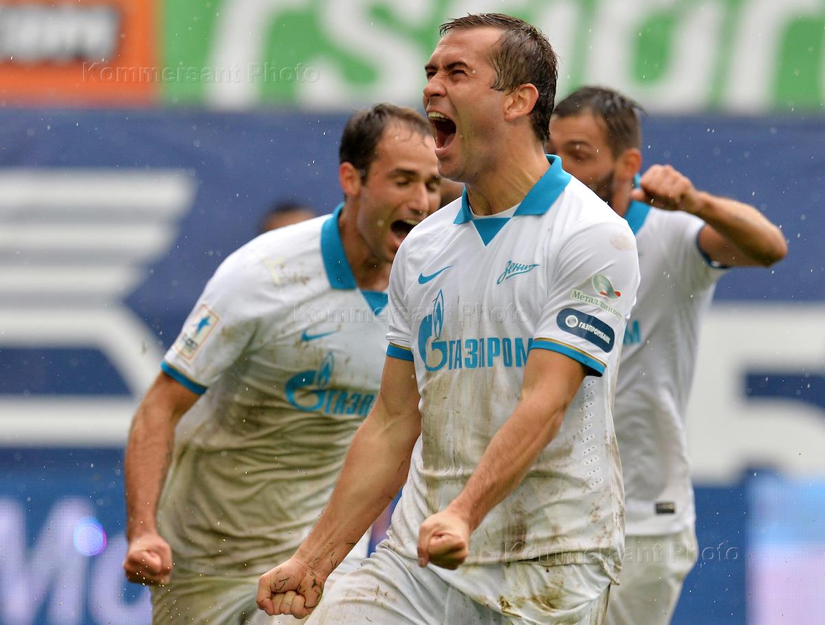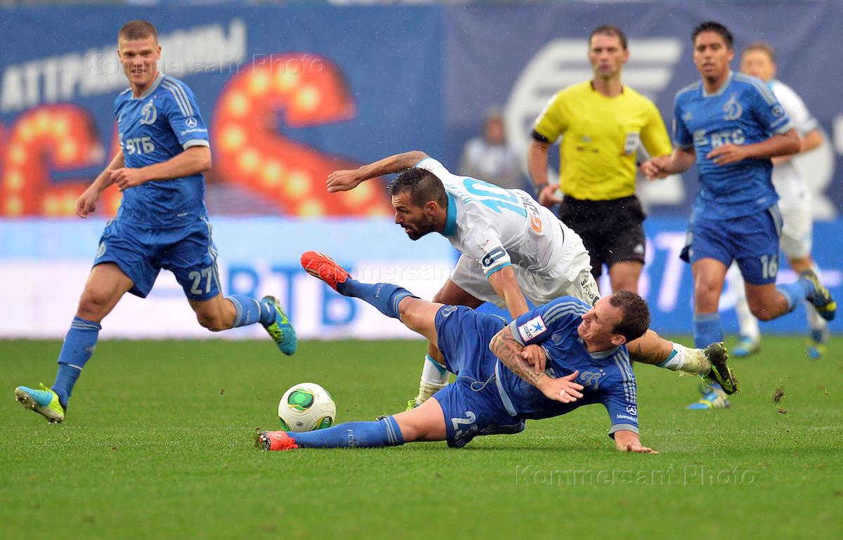 СОГАЗ - Чемпионат России по футболу среди клубов Премьер-Лиги 2013/2014. 6 тур. Нападающий ФК "Зенит" Александр Кержаков (в центре) во время матча между командами "Динамо" (Москва) и "Зенит" (Санкт-Петербург). Матч прошел на стадионе "Арена Химки".