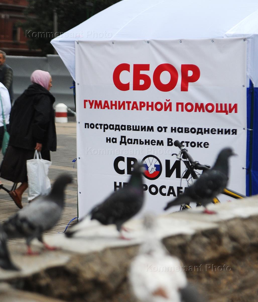 Beginning of work center for the collection of humanitarian aid for flood victims in the Far East, organized by the All-Russian public organization "Young Guard of United Russia".