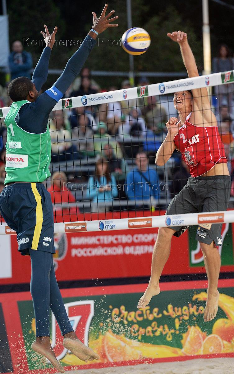 Игрок сборной Бразилии Эвандро Оливейро Жуниор (слева) и игрок сборной Латвии Янис Шмединьш (справа) в финальном матче мужского турнира этапа "Большого шлема" по пляжному волейболу между командами Бразилии и Латвии.