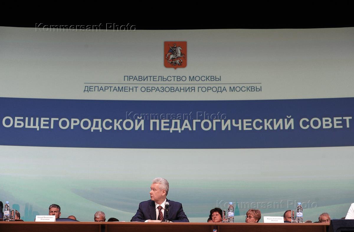 Acting Mayor of Moscow Sergei Sobyanin (center) during a meeting of the Citywide Open Pedagogical Council in anticipation of the beginning of the new school year. meeting was held in the great hall of the Moscow City Palace of children (teenagers) creativity.
