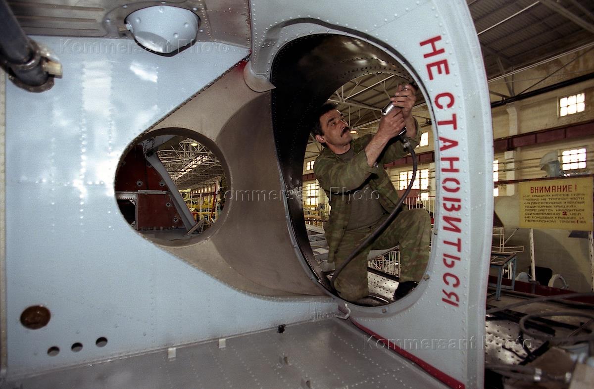 Производственные цеха ОАО "Росвертол". Рабочие во время сборки вертолета.