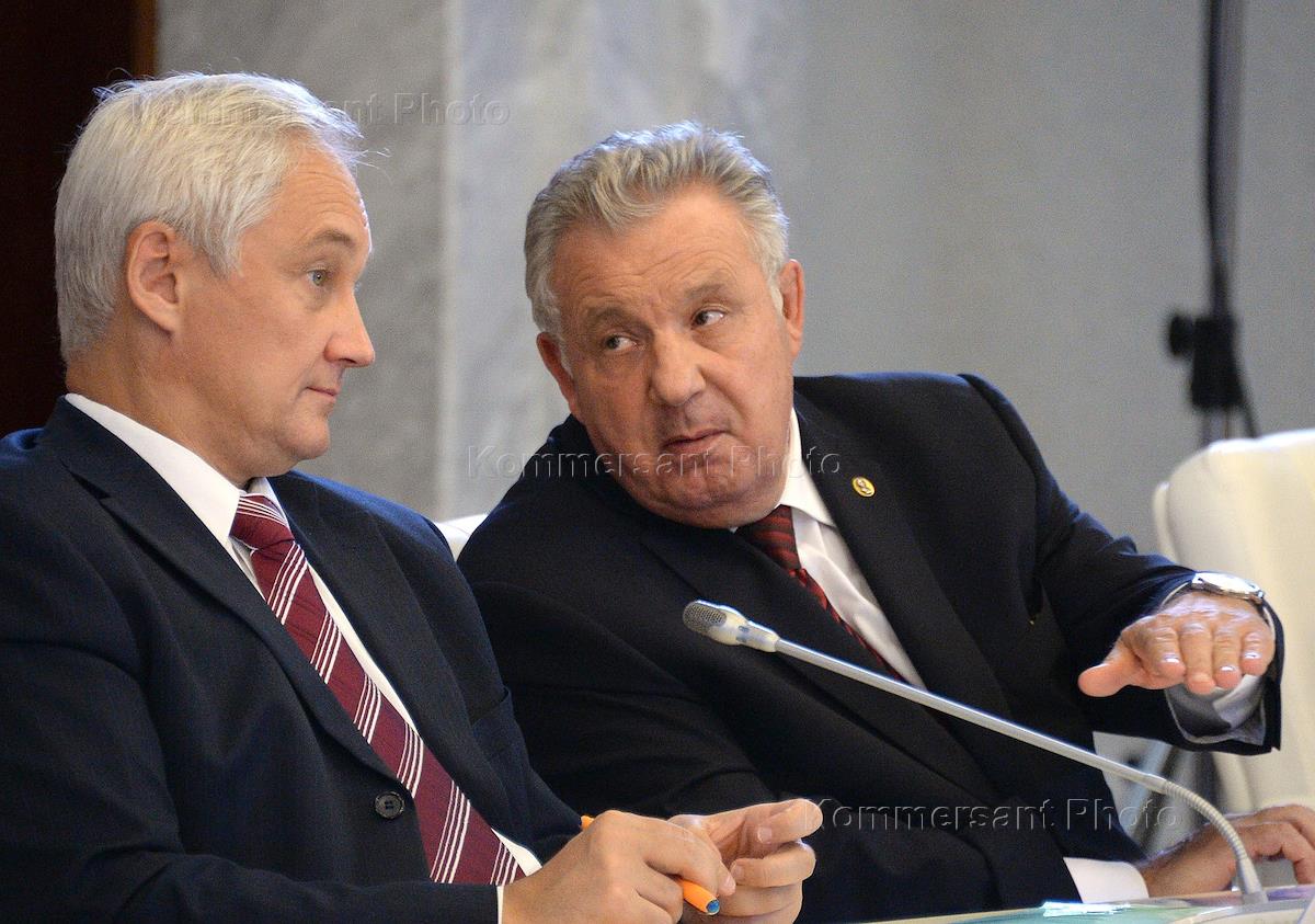 Помощник президента России Андрей Белоусов (слева) и министр России по развитию Дальнего Востока – полномочный представитель президента России в Дальневосточном федеральном округе Виктор Ишаев (справа) на совещании о перспективах развития гражданского судостроения в России.