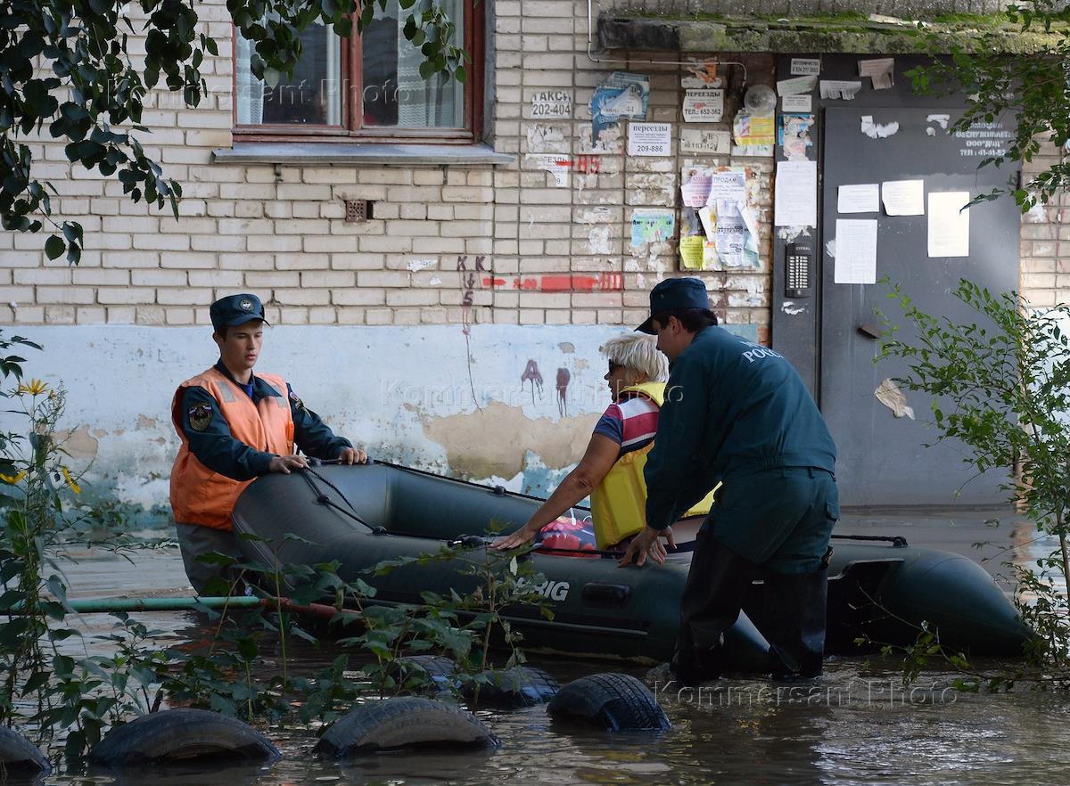 The consequences of flooding in the city. Emergency workers during the rescue residents of flooded homes.