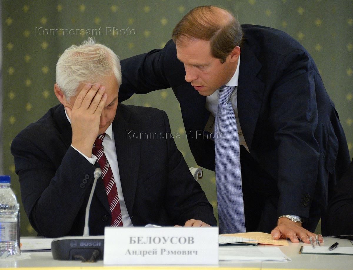 Помощник Президента России Андрей Белоусов (слева) и министр промышленности и торговли России Денис Мантуров (справа) во время заседания Комиссии при президенте России по вопросам стратегии развития топливно-энергетического комплекса и экологической безопасности в Кемерово.