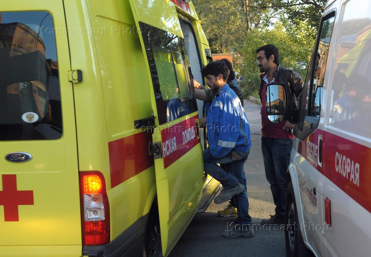 Автомобиль медицинской службы "Реанимация" во время госпитализации строителей нового терминала аэропорта "Пулково", отравившихся во время обеда.