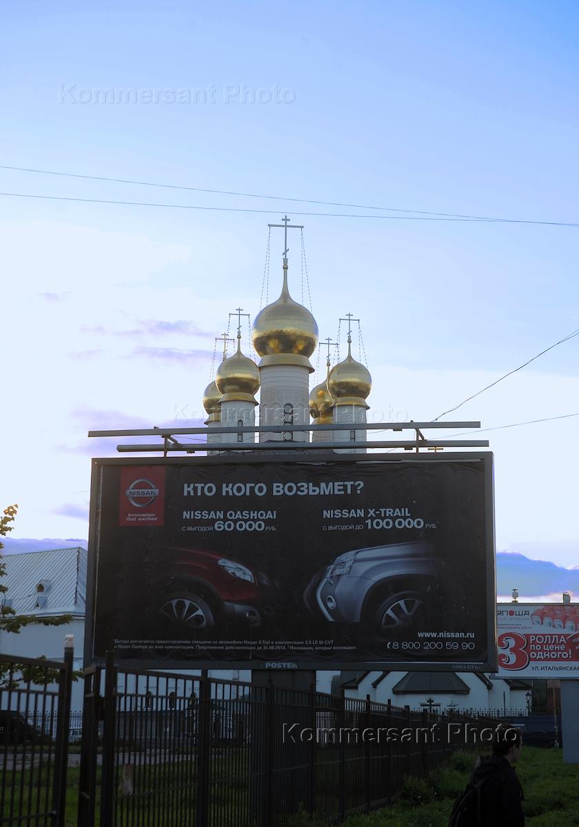 Рекламный плакат автомобилей Nissan (Ниссан) и купола православного храма.