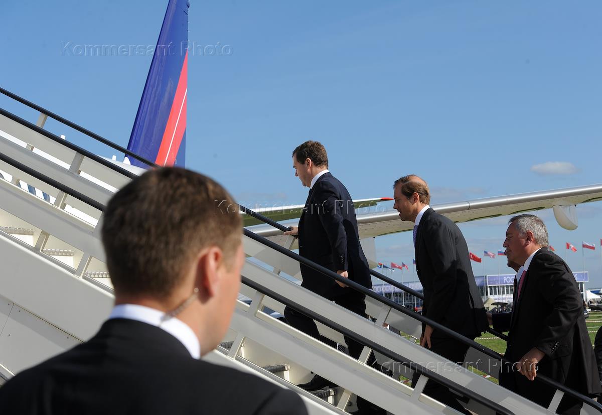 Opening of the XI International Aviation and Space Salon "MAKS-2013" on the territory of the Federal State Unitary Enterprise "Gromov Flight Research Institute". Russian Prime Minister Dmitry Medvedev (second left) at the airport.