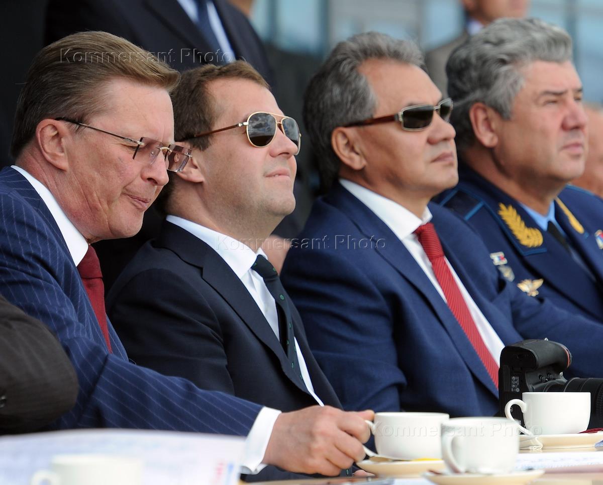 Открытие XI Международного авиационно-космическего салона МАКС-2013 на территории ФГУП "ЛИИ имени М.М.Громова". Слева направо: руководитель администрации президента России Сергей Иванов, председатель правительства России Дмитрий Медведев, министр обороны России Сергей Шойгу во время демонстрационных полетов авиационной техники.