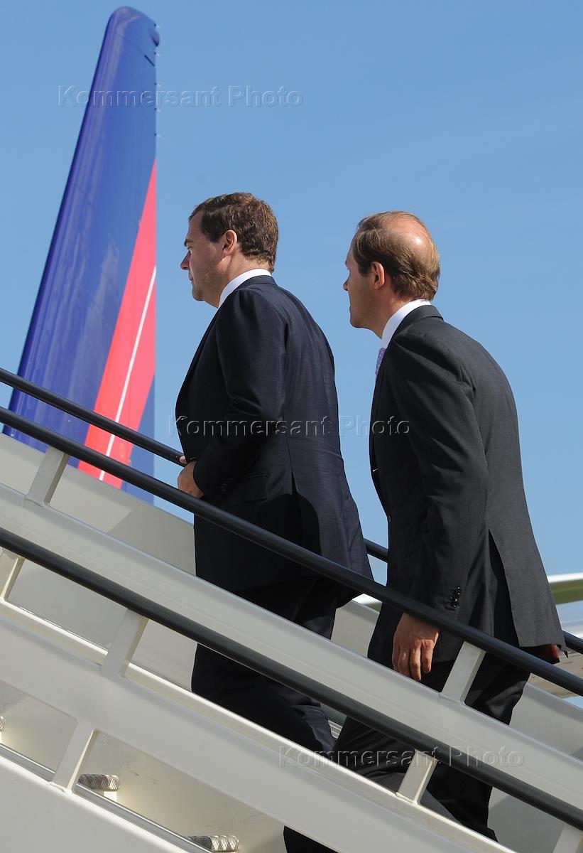 Открытие XI Международного авиационно-космическего салона МАКС-2013 на территории ФГУП "ЛИИ имени М.М.Громова". Слева направо: председатель правительства России Дмитрий Медведев, министр промышленности и торговли России Денис Мантуров на трапе самолета "Сухой СуперДжет-100".