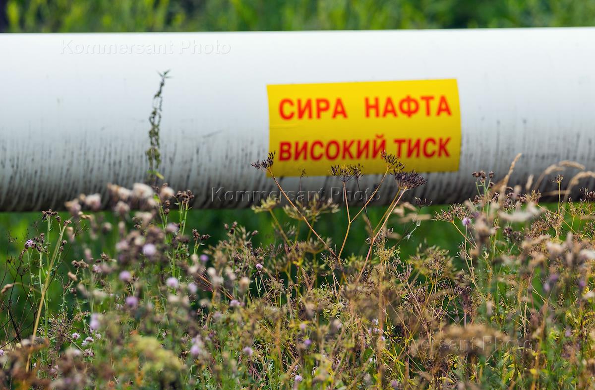 The oil pipeline "Druzhba". The inscription on the tube "Crude oil, high pressure".