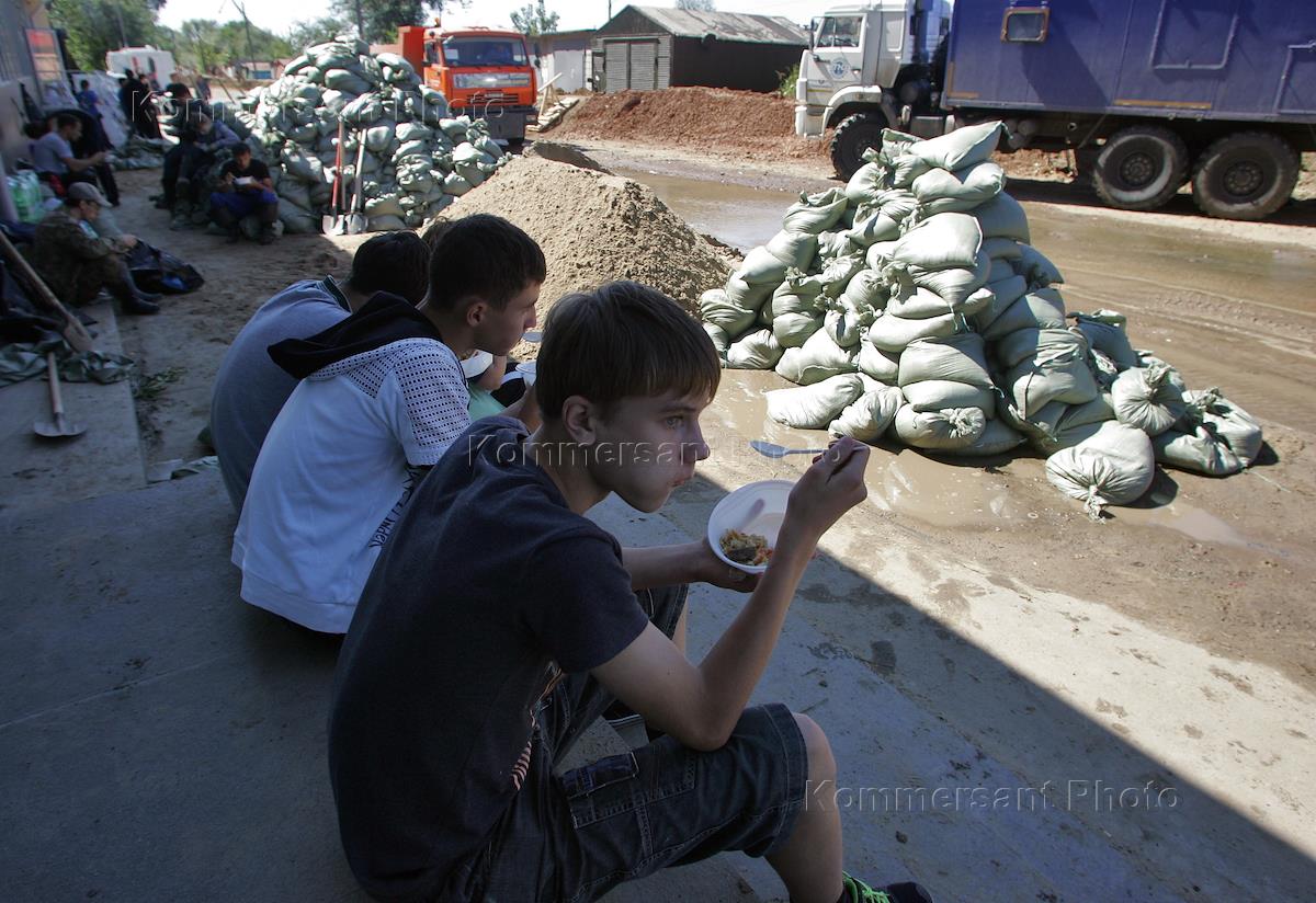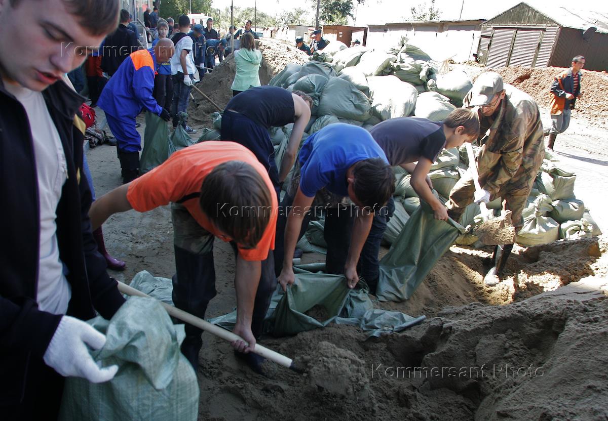 Consequences of the floods in Khabarovsk. Volunteers, kids, teens gaining sand into bags.