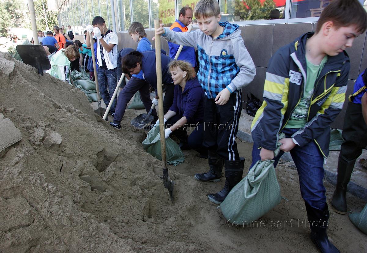 Consequences of the floods in Khabarovsk. Volunteers, kids, teens gaining sand into bags.