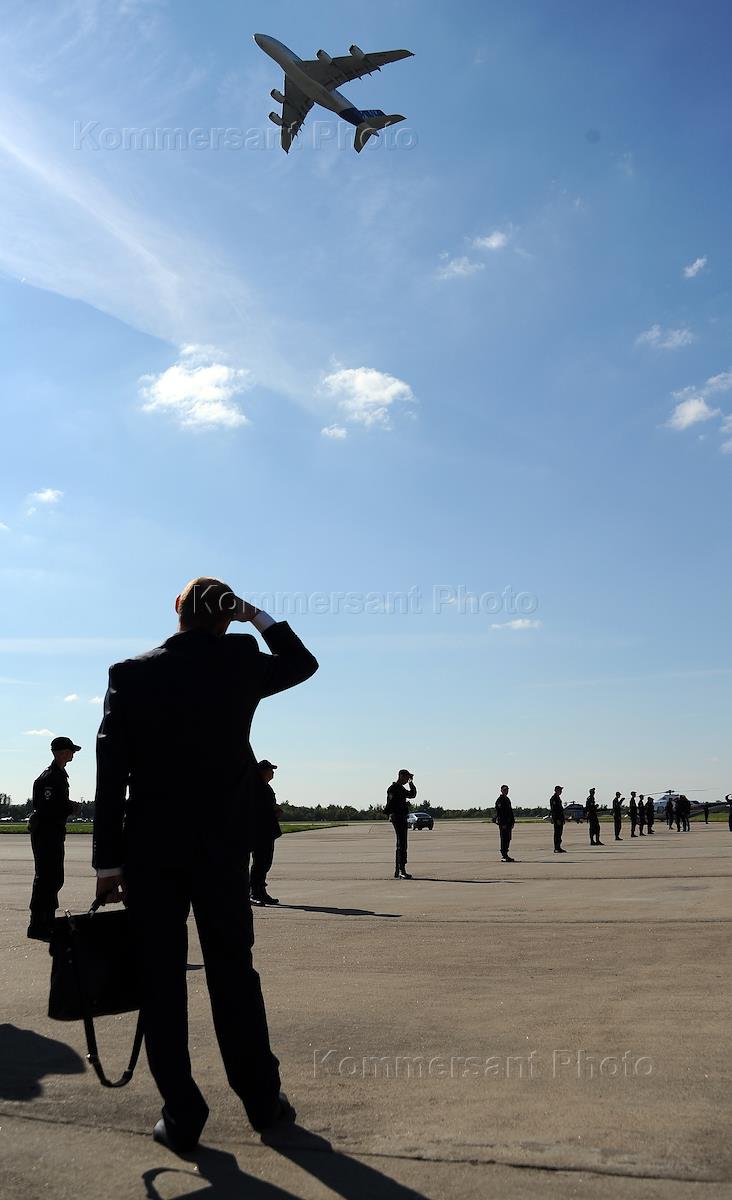 Работа XI Международного авиационно-космического салона МАКС-2013 на территории ФГУП "ЛИИ имени М.М.Громова". Демонстрационный полет самолета Airbus А380.