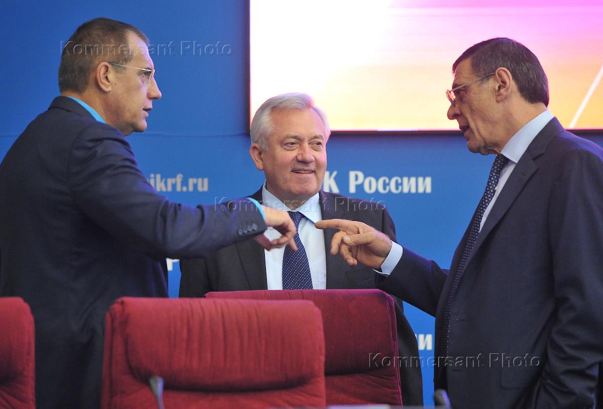 Заместитель председателя Центральной избирательной комиссии (ЦИК) России Леонид Ивлев (в центре) и члены ЦИК России Сергей Даниленко (слева) и Борис Эбзеев (справа) на заседании Центризбиркома России.