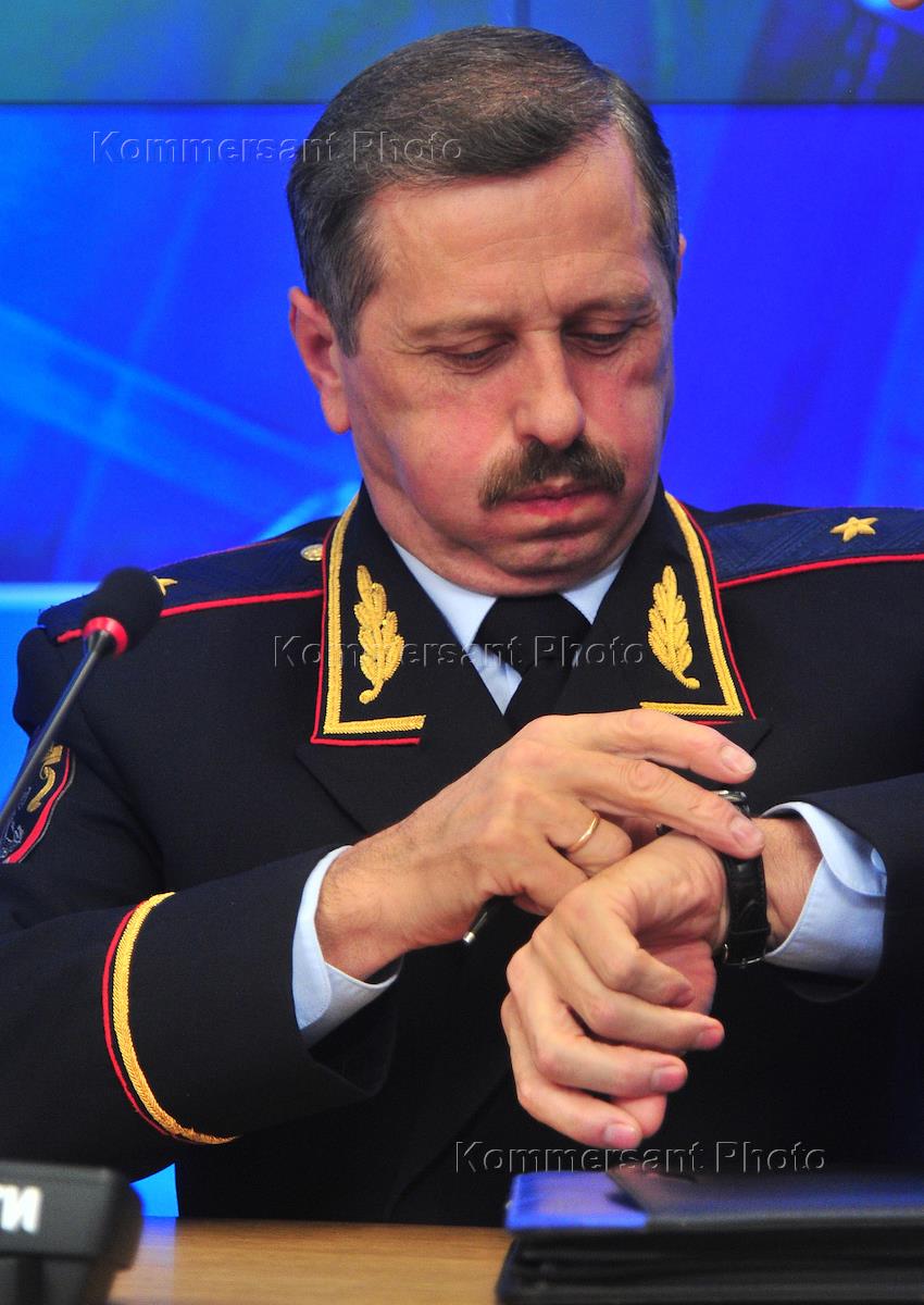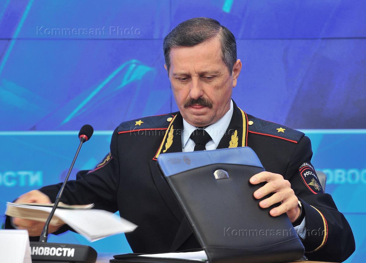 Заместитель начальника Главного управления по обеспечению безопасности дорожного движения МВД России генерал-майор полиции Владимир Кузин во время проведения мультимедийной пресс-конференции на тему: "Изменения в КоАп и повышение штрафов за нарушения ПДД с 1 сентября 2013 года". Пресс-конференция прошла в РИА "Новости".