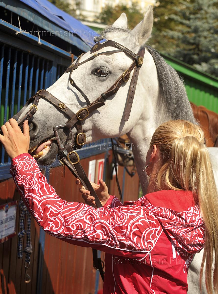 Международный военно-музыкальный фестивал "Спасская башня". День открытых дверей Кремлевской школы верховой езды в Тайницком саду Московского Кремля. Подготовка лошади к выступлению.