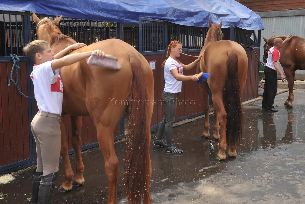Международный военно-музыкальный фестивал "Спасская башня". День открытых дверей Кремлевской школы верховой езды в Тайницком саду Московского Кремля. Подготовка лошадей к выступлению.