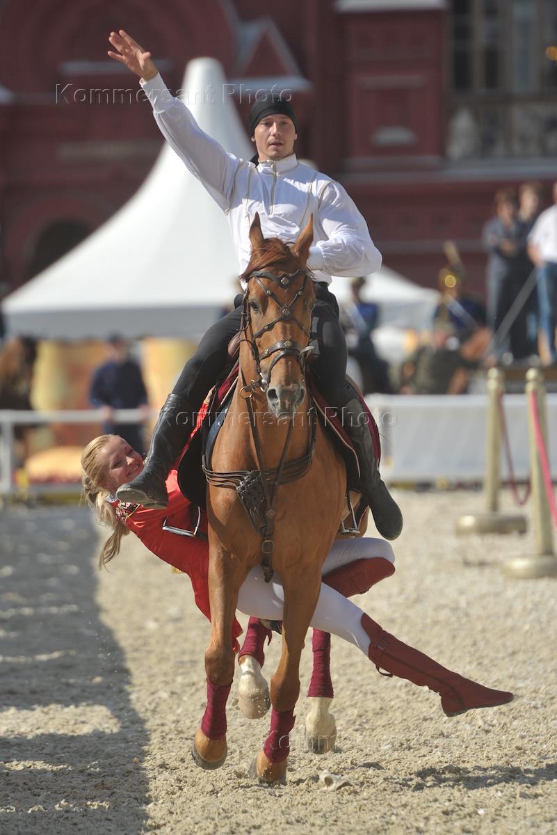 Международный военно-музыкальный фестивал "Спасская башня". День открытых дверей Кремлевской школы верховой езды в Тайницком саду Московского Кремля. Участница фестиваля во время репетиции выступления.